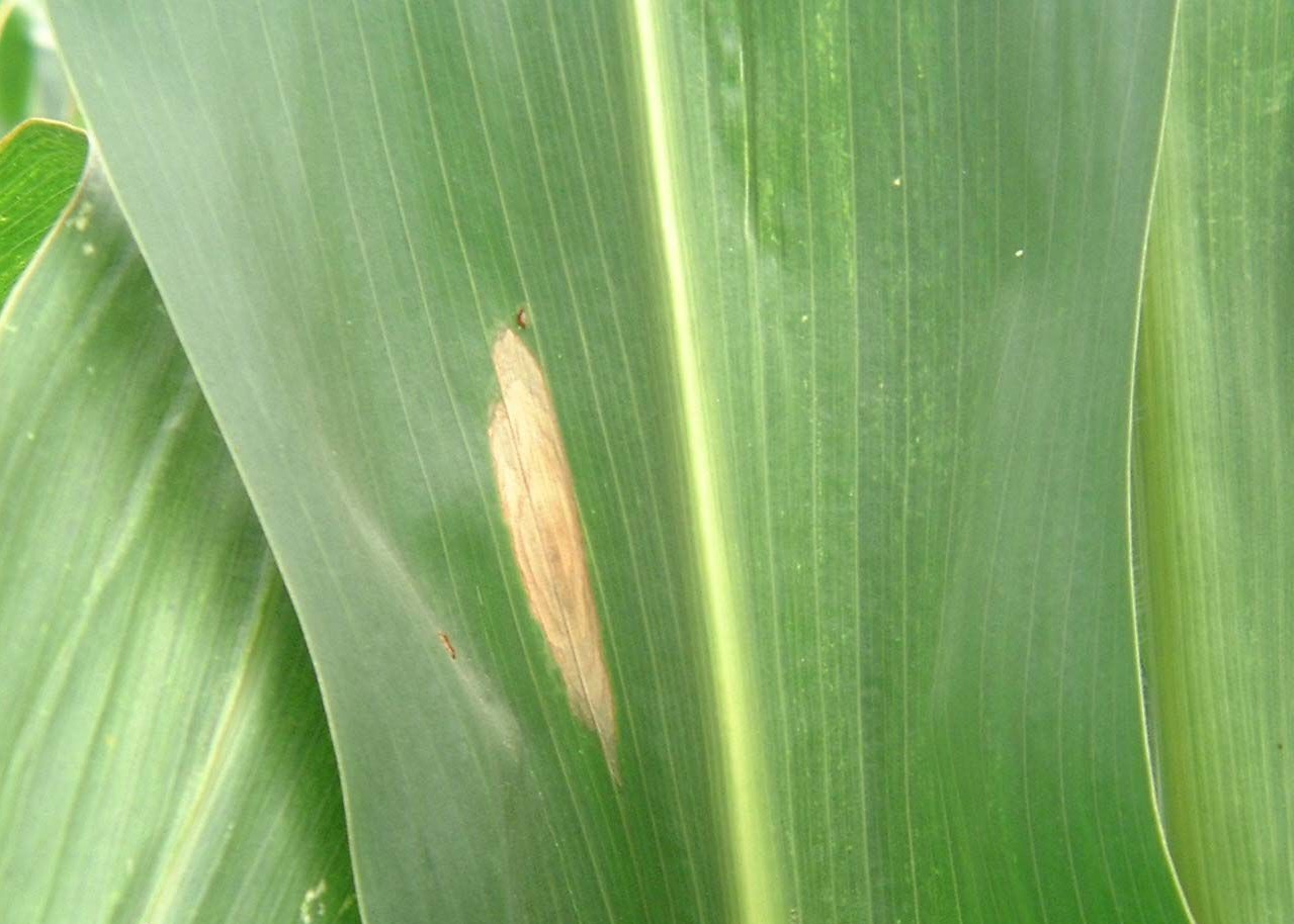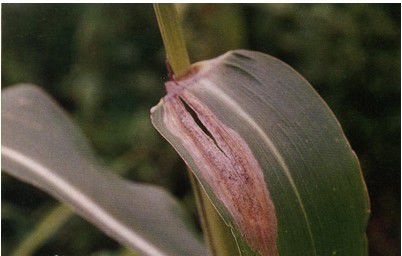 癥狀 主要發(fā)生在比較冷涼的深丘區(qū)和山區(qū),可危害所有玉米類(lèi)型。 病菌主要危害葉片,也可侵染葉鞘和苞葉。植株感病后,常使葉片干枯,重者全株枯死,產(chǎn)量失收,輕者生長(zhǎng)不良,造成減產(chǎn)。株高70~100厘米時(shí),先由基部葉片發(fā)病,漸及上部,嚴(yán)重時(shí)能遍及全株。發(fā)病初期,葉片上出現(xiàn)水漬狀青灰色或灰綠色斑點(diǎn),然后沿葉脈向兩端擴(kuò)展,形成棱形或長(zhǎng)紡錘形大斑。斑中央淡褐色,邊緣暗褐色。病斑寬可達(dá)1~2厘米,長(zhǎng)15~20厘米。天氣潮濕時(shí),病斑上可產(chǎn)生黑灰色霉?fàn)钗铮ǚ稚咦樱?。發(fā)病嚴(yán)重時(shí),病斑增多,連成大片,整株枯死。